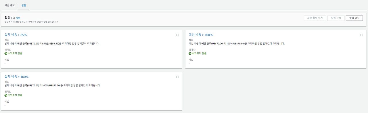 예상 비용이 예산의 100%가 넘었을 때, 실제 금액이 예산의 85%가 넘었을 때, 사용 금액이 예산의 100%가 넘었을 때.