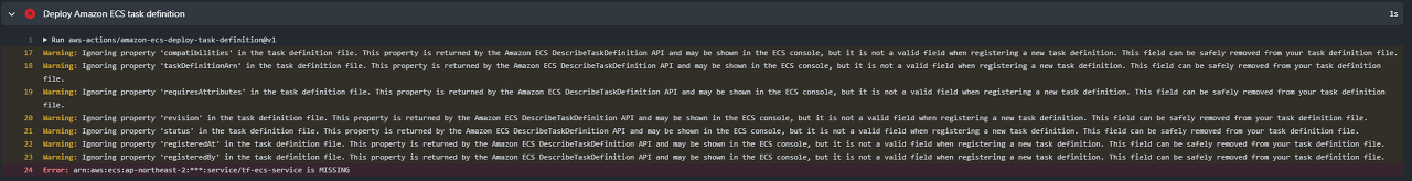 맞지 않는 클러스터명으로 배포를 시도하고 있으니, 서비스를 당연히 찾을 수 없고 그렇기 때문에 arn MISSING 에러가 발생하던 것이었다.