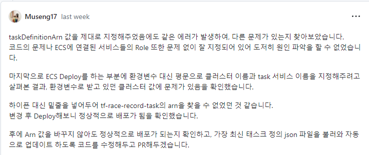 기존의 yml 코드와 비교도 하고, task-definition.json 파일을 직접 넣어 배포 시도도 해보고, json 파일을 하나하나 비교하며 무슨 arn이 문제인가 싶어 다 찾아봤지만... 도저히 원인을 알 수 없었다.